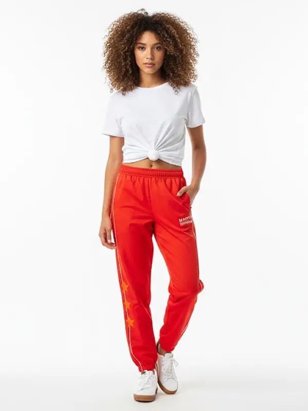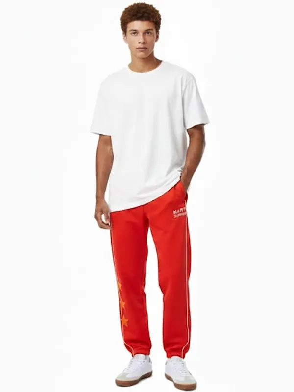 Elevate your streetwear game with these A24 Marty Supreme Red Track Trouser. Designed for both comfort and style, they feature a vibrant red finish, sleek white piping, and signature orange star graphics on the leg. The elastic waistband and cuffed ankles ensure a perfect fit, making them an essential addition to any modern, active wardrobe today. (59 words)