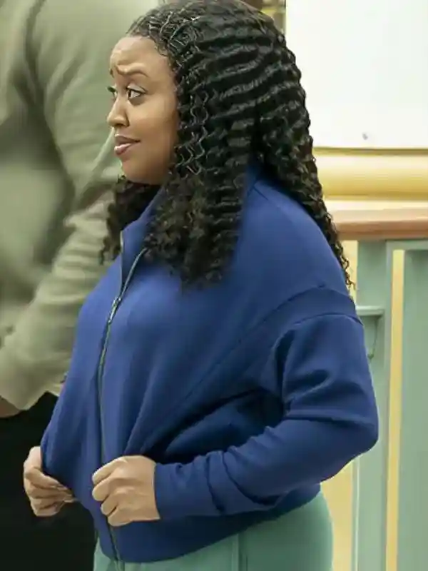 The Quinta Brunson Blue Jacket from Abbott Elementary series is designed with fleece fabric, soft viscose lining, full length sleeves, ribbed cuffs, stand up collar, zipper closure, two outside pockets, blue color. It suits casual outings and comfortable everyday fashion.