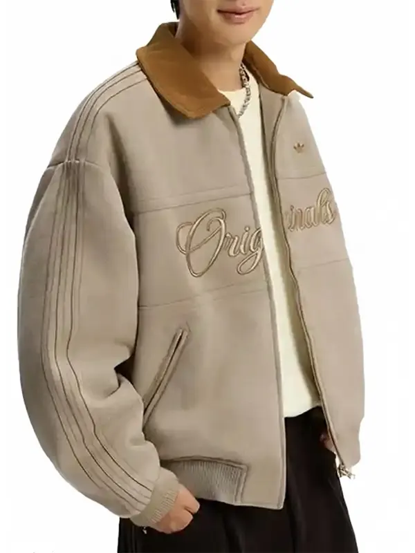 The Adidas New Year Beige Suede Bomber Jacket is crafted using suede leather, soft viscose lining, full length sleeves, ribbed cuffs, shirt style collar, zipper closure, two outside pockets, two inside pockets, beige color. Perfect for casual outings and stylish everyday fashion.