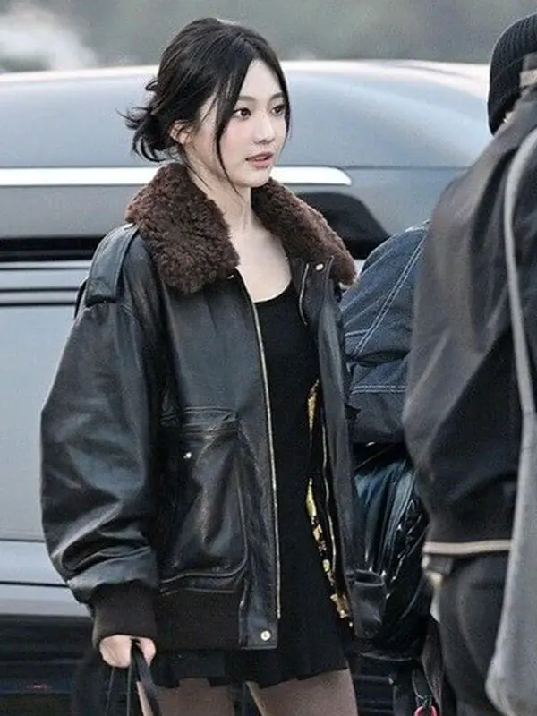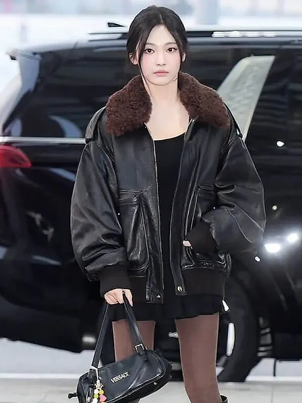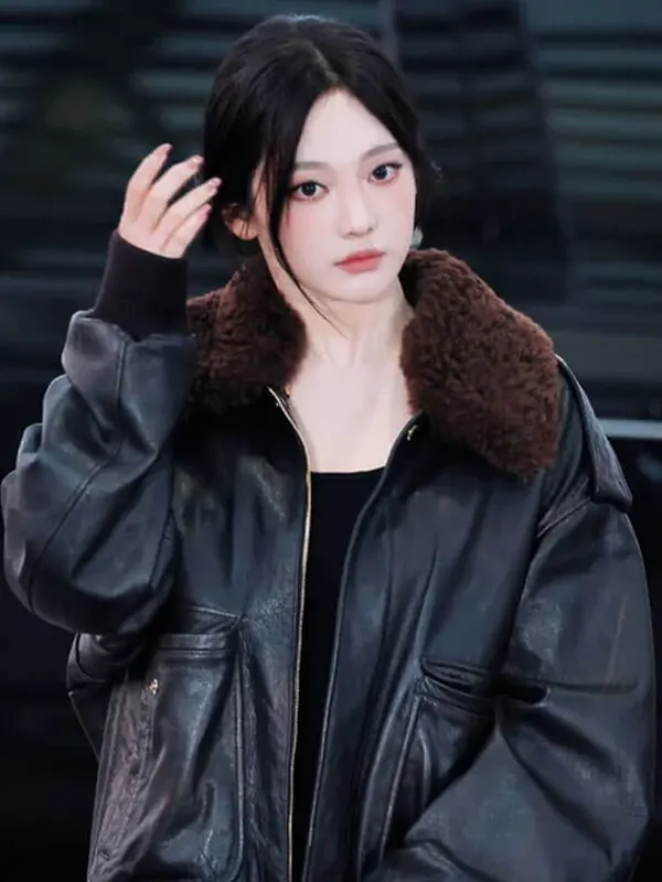 Ningning Aespa Faux Fur Collar Black Bomber Leather Jacket