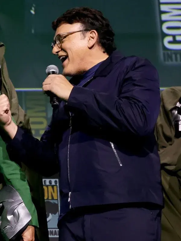 Capture the effortless style of director Anthony Russo with this sleek navy blue jacket, seen at the Avengers: Doomsday reveal. Made from high-quality cotton fabric, it features a classic shirt-style collar and a modern zipper front closure. Perfect for casual outings or layering, this lightweight jacket combines comfort with a refined cinematic aesthetic for any Marvel enthusiast.