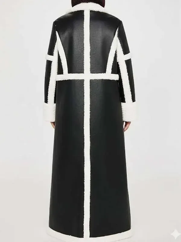 Dana Thomas Black Shearling Coat from Beyond the Gates is crafted using genuine leather with shearling lining, full length sleeves, shearling cuffs, shearling lapel, and open closure, featuring two outside pockets and one inside pocket. It is perfect for cold weather, winter outings, and stylish evening appearances.