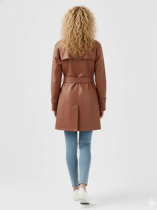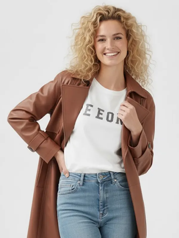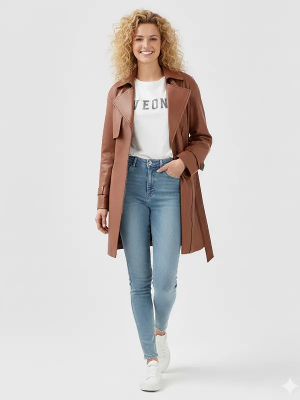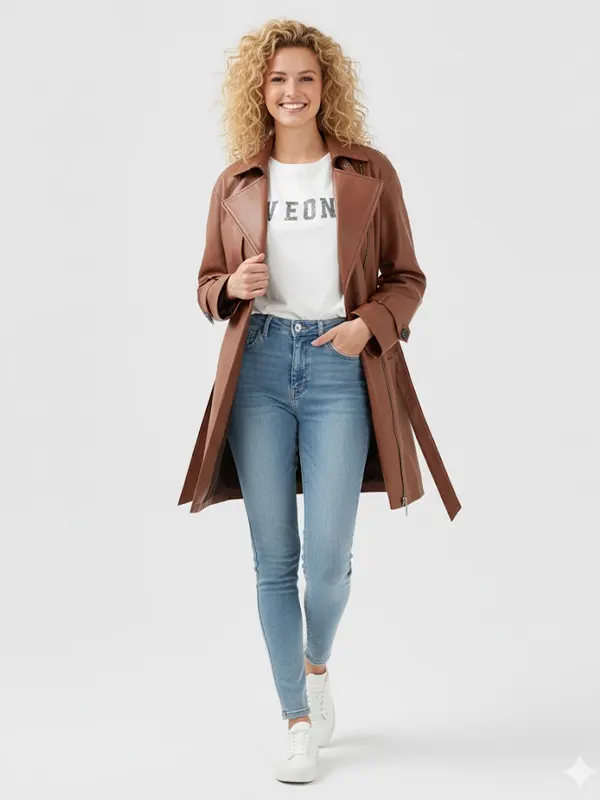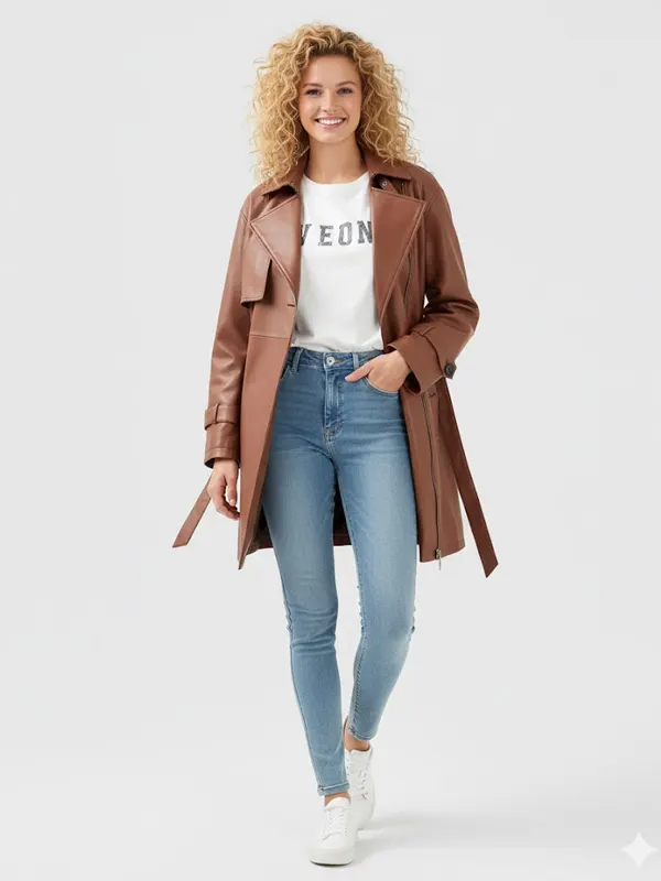 This jacket features rich brown leather with a belted waist, soft inner lining, full sleeves, and a structured silhouette that enhances shape beautifully. It balances classic elegance with modern styling. It is perfect for casual wear, office looks, evening outings, or anyone wanting a flattering leather jacket with timeless charm.