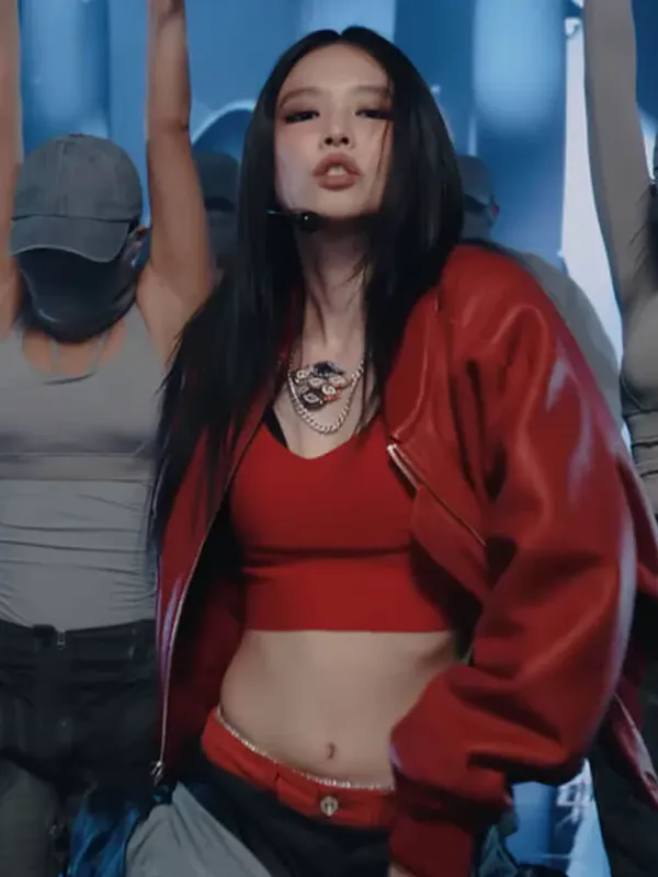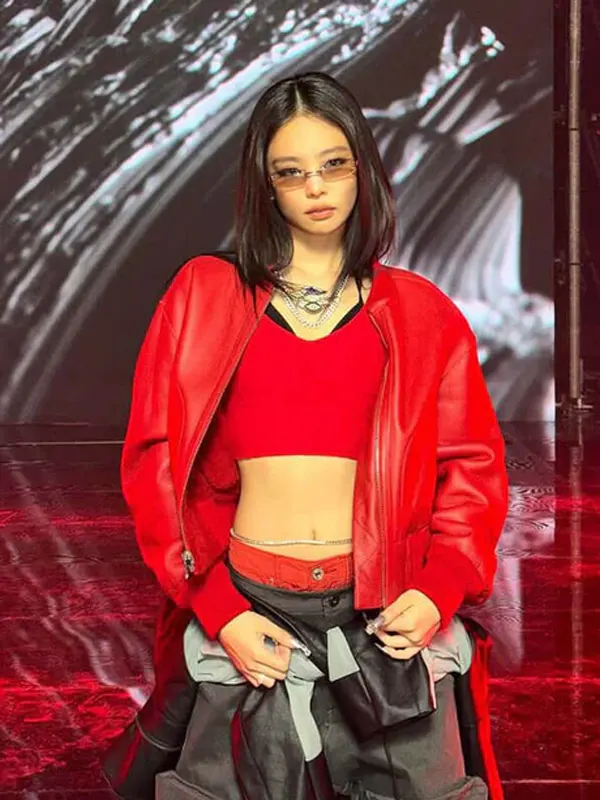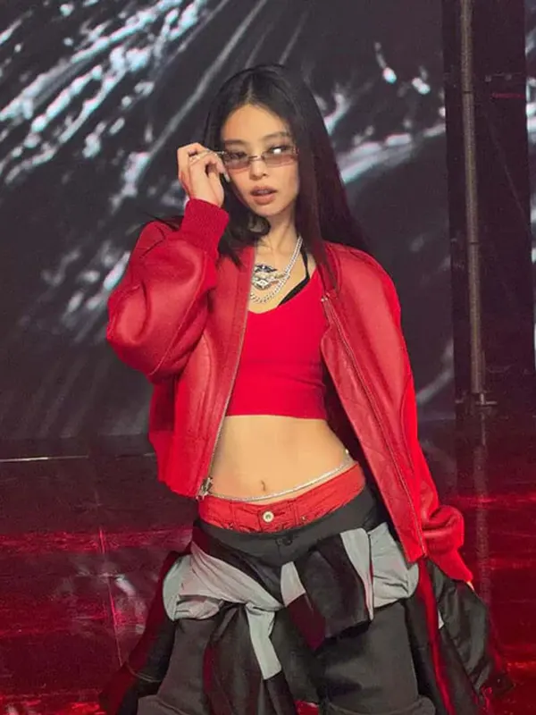 Official Live Performance Jennie Kim Red Bomber Leather Jacket