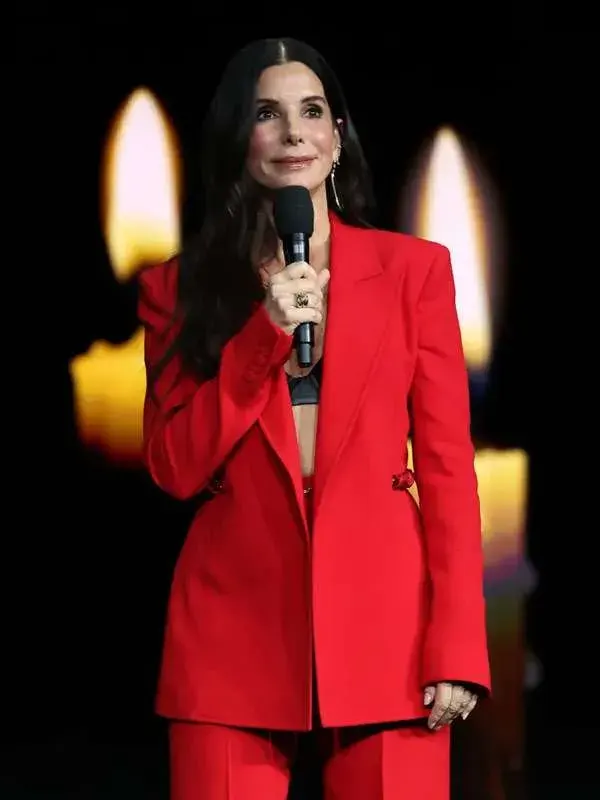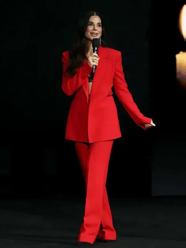 Styled by Sandra Bullock at the CinemaCon event, this Red Blazer is created using suiting fabric, soft viscose lining, full length sleeves, buttoned cuff, lapel style collar, and open closure, featuring two outside pockets and two inside pockets. It suits formal events and bold fashion styling.