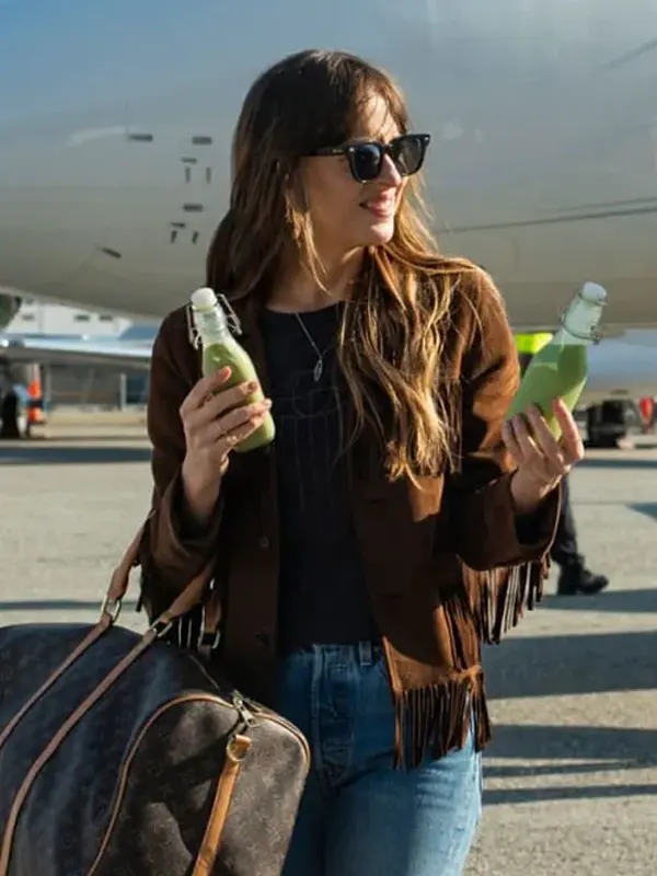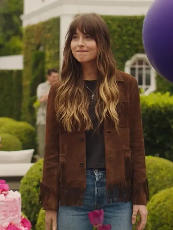 This jacket is inspired by Dakota Johnson’s look in The High Note, crafted in brown suede with a soft lining and a tailored fit. It delivers understated elegance with a vintage vibe. Perfect for autumn outings, casual chic wear, cozy evenings, or fans wanting a warm, classy suede jacket with subtle movie-star charm.