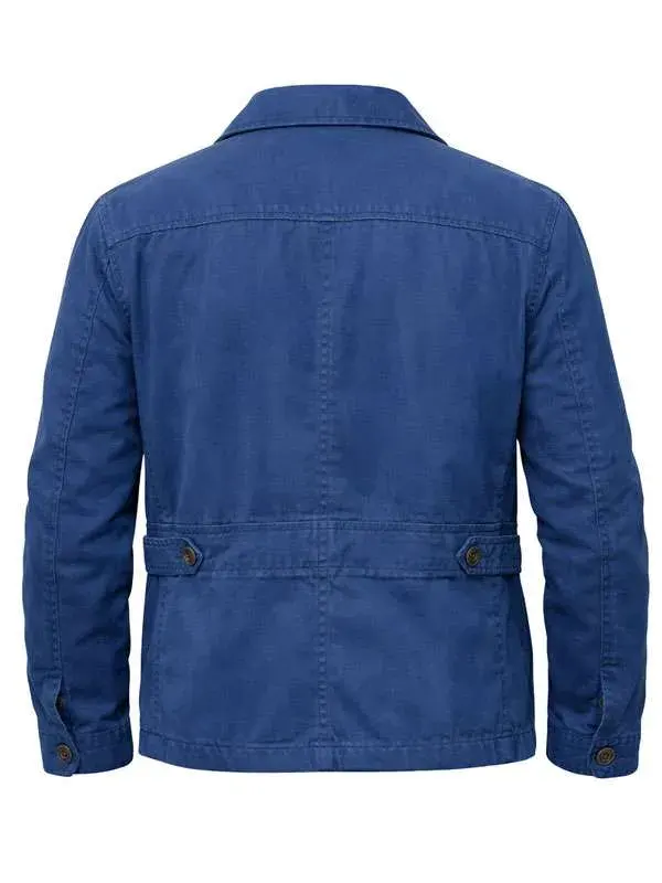 Don Gilet Blue Jacket from the Death In Paradise series is made using cotton fabric with soft viscose lining, full length sleeves, buttoned cuffs, shirt style collar, and button closure, featuring three outside pockets and two inside pockets. Perfect for casual outings, city strolls, and stylish weekend wear.