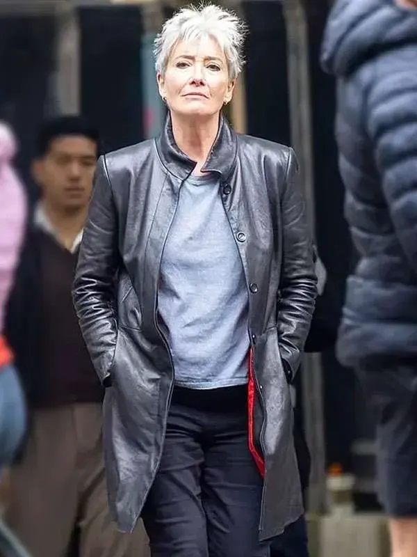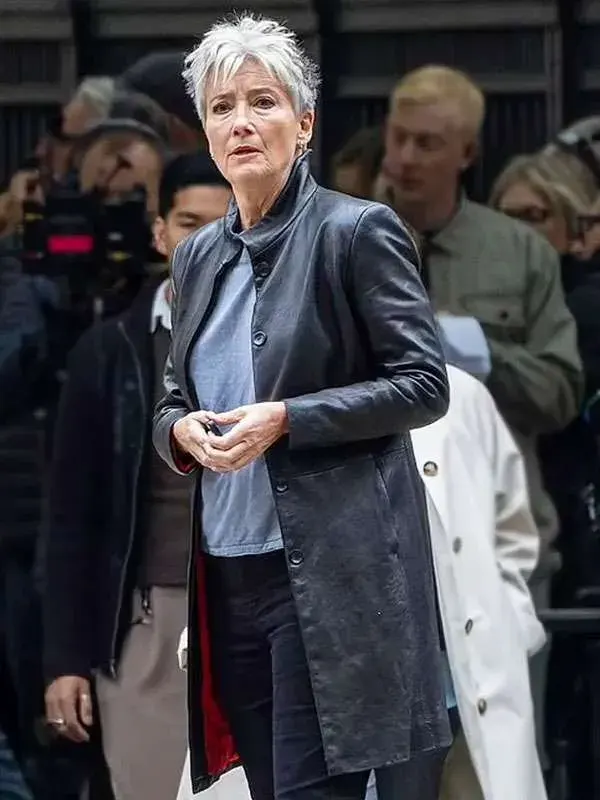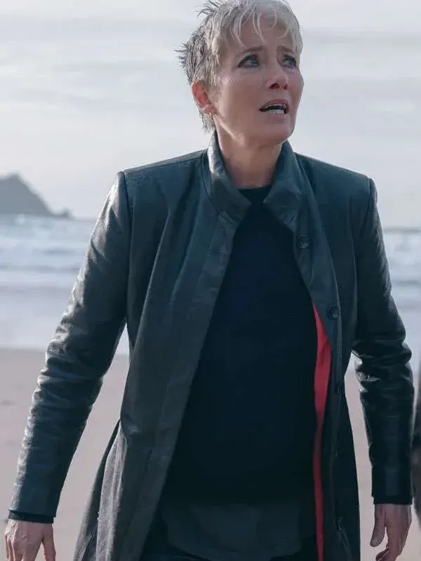 Zoë Boehm TV Series Down Cemetery Road 2025 Emma Thompson Black Leather Trench Coat