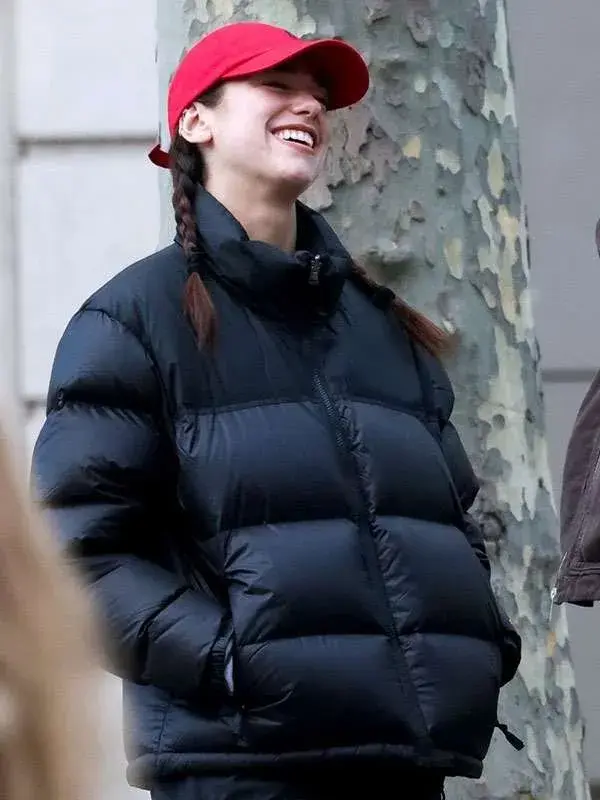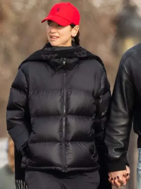 This Dua Lipa Black Puffer Jacket is made using parachute fabric with soft viscose lining, full length sleeves, elastic cuffs, stand up collar, and zipper closure, featuring two outside pockets and one inside pocket. It is perfect for winter outings, travel days, and comfortable everyday street style fashion.