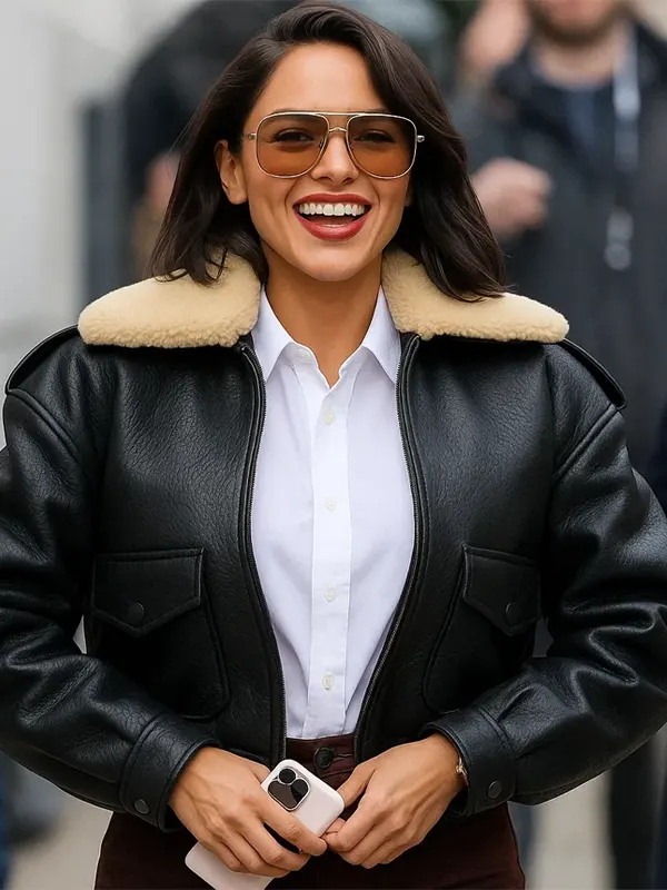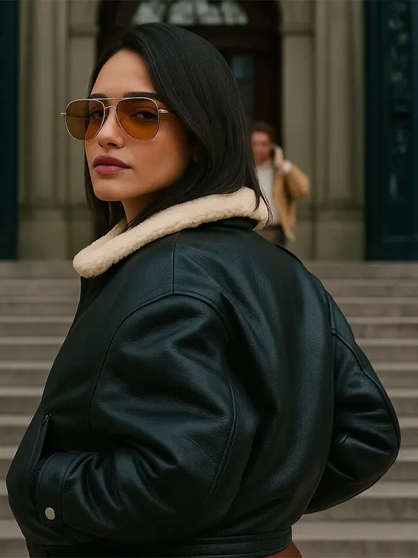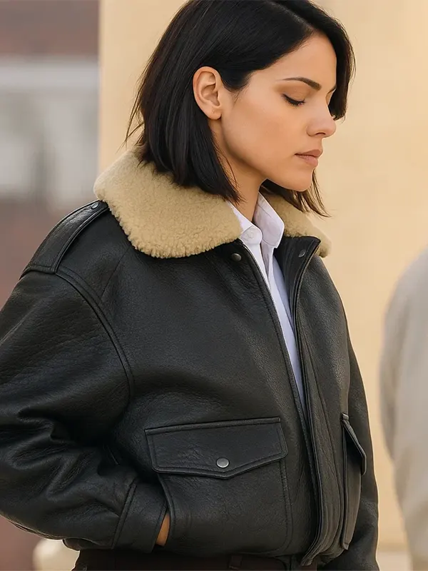 Esme Movie Fountain of Youth 2025 Eiza Gonzalez Black Leather Jacket
