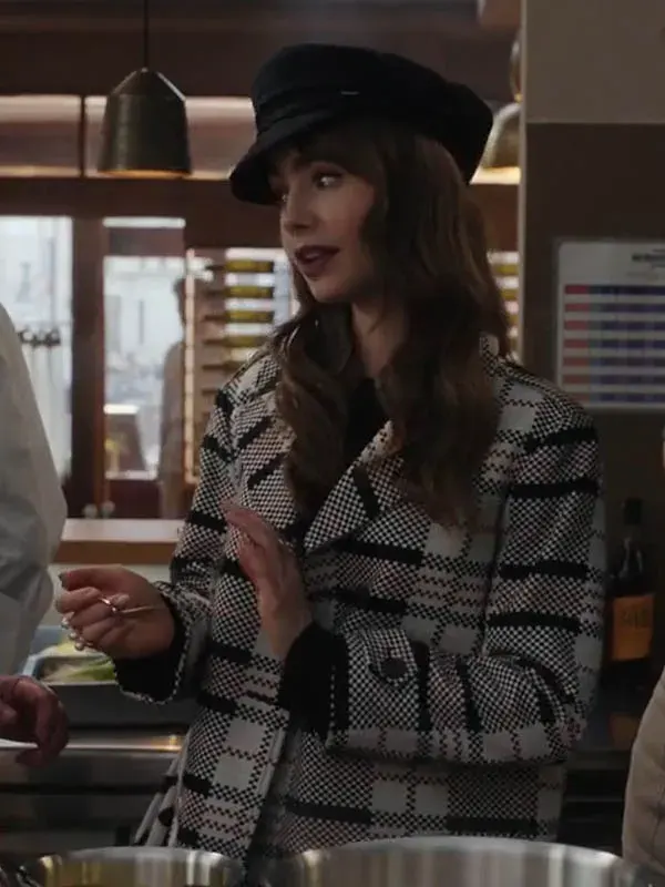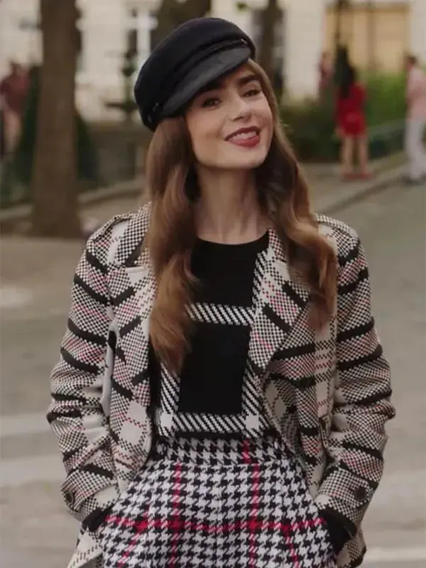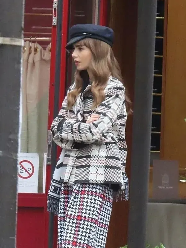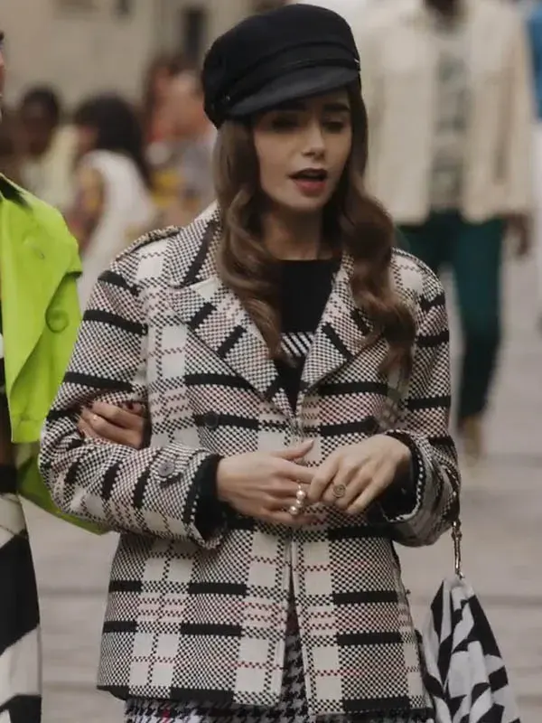 Lily Collins TV Series Emily In Paris Emily Cooper Black And White Check Pattern Wool Jacket