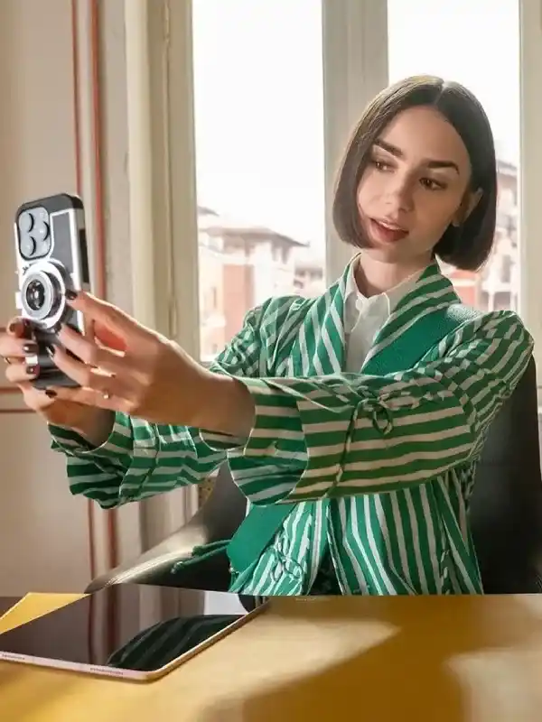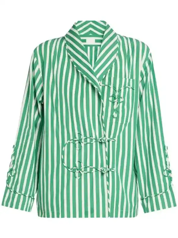 The Emily Cooper Green Striped Blazer from Emily in Paris is made using quality cotton fabric, soft viscose lining inside, full length sleeves, lace up cuffs, a lapel style collar, knotted button closure front, and one outside pocket. It works well for stylish work outfits, brunches, and seasonal layering.