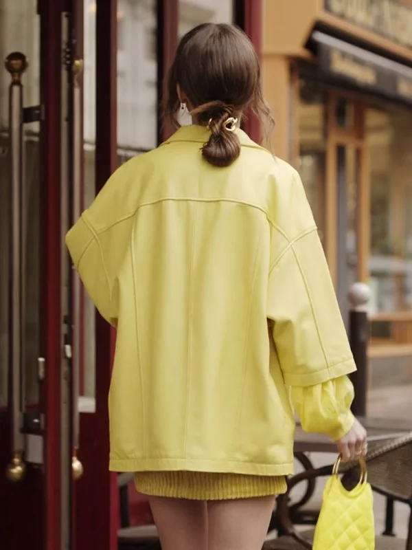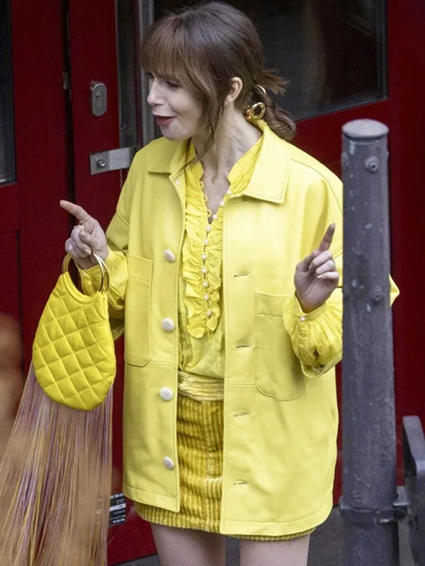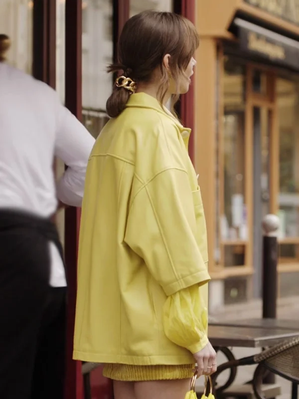 Emily In Paris Lily Collins Yellow Leather Jacket