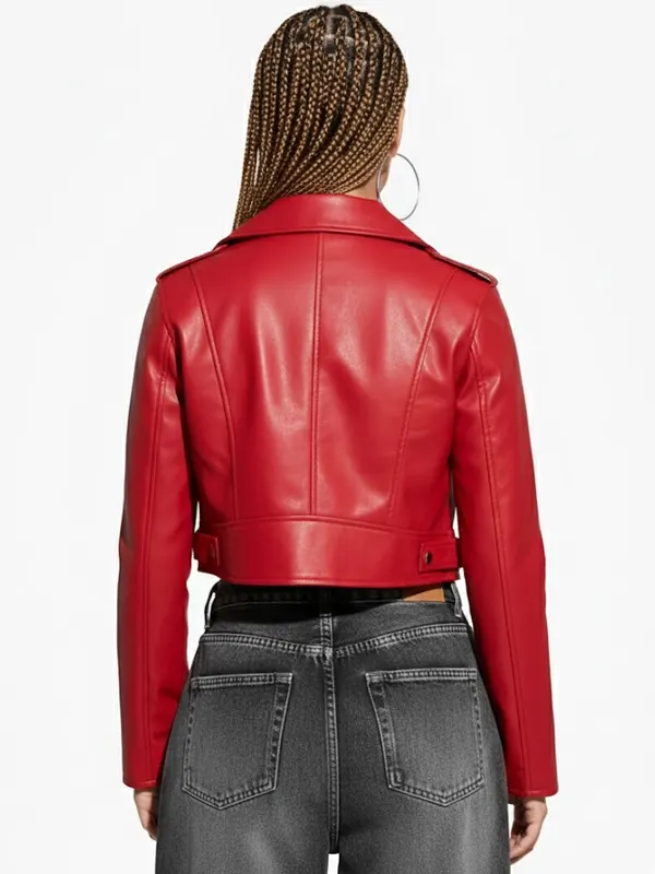 This jacket features bold red leather with a cropped moto design, smooth inner lining, full sleeves, zip closure, and a fitted silhouette for a modern edge. It brings effortless attitude to outfits. It is perfect for streetwear looks, casual nights out, fashion events, and anyone wanting a standout jacket that energizes daily style.
