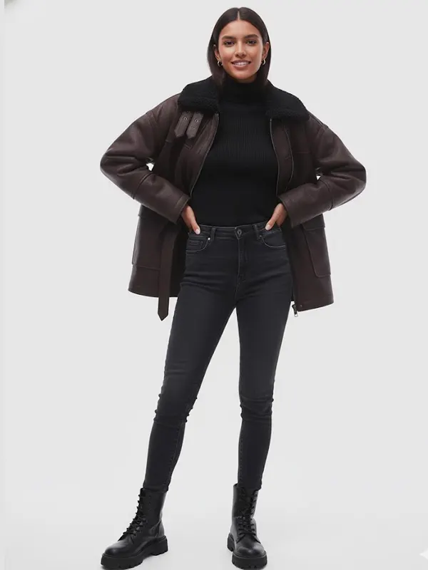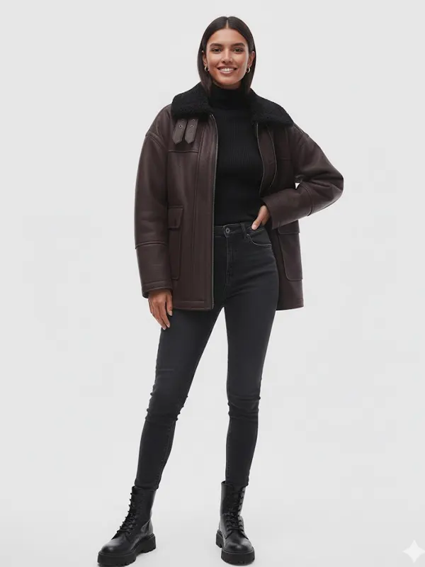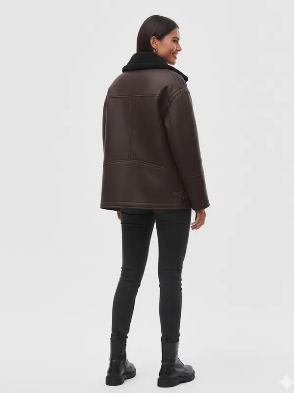 This jacket features faux leather with borg shearling lining, aviator-inspired design, midi length, full sleeves, and warm construction for cold-weather comfort. Its classic look adds bold character to winter outfits. It is perfect for winter outings, travel, casual wear, or anyone wanting cozy statement outerwear with vintage charm.