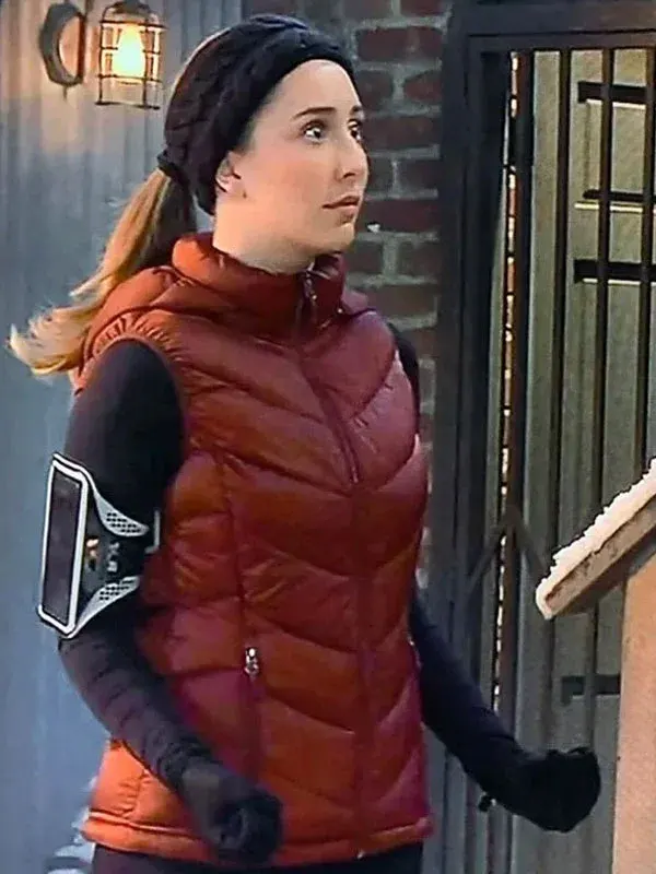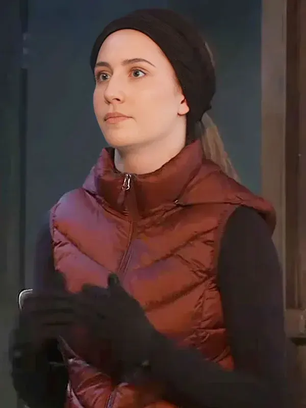 Josslyn Jacks Red Puffer Vest from the General Hospital series is crafted using parachute fabric, soft viscose lining, hooded style collar, and zipper closure, featuring two outside pockets and one inside pocket in dark red color. It suits layered winter looks and casual outings.