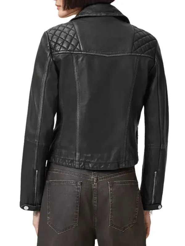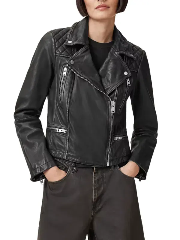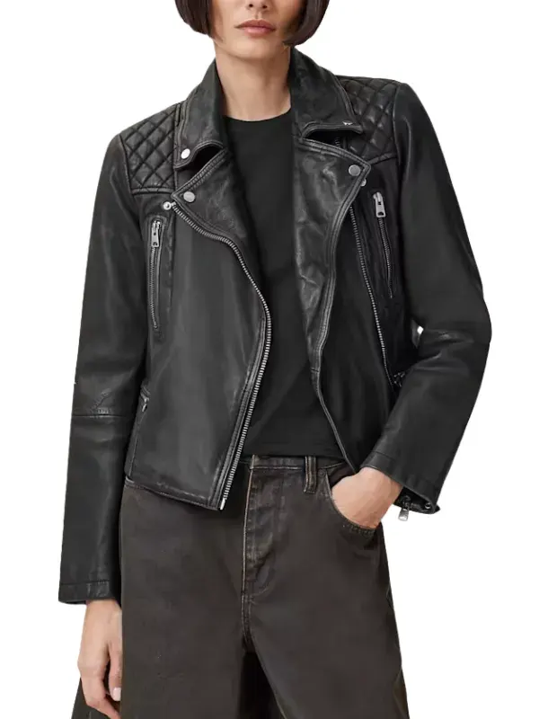 Worn by Greta in How To Get To Heaven From Belfast series, this black biker jacket is created using genuine leather, soft viscose lining, full length sleeves, zipper cuffs, lapel style collar, and zipper closure, featuring four outside pockets and two inside pockets. It suits edgy looks and bold fashion.