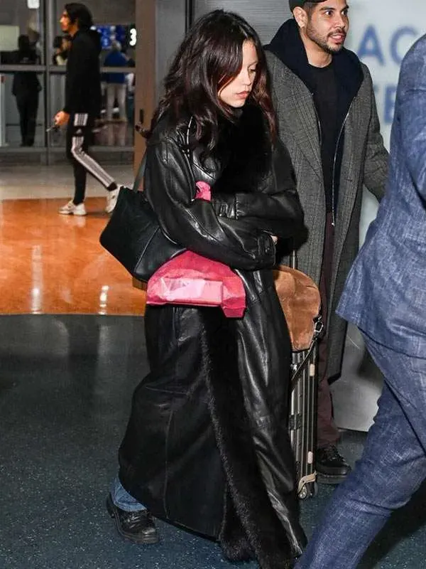 American Actress Jenna Ortega Shearling Black Leather Coat