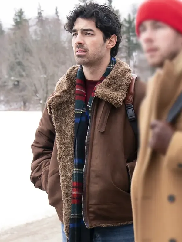 A Very Jonas Christmas Movie 2025 Joe Jonas Brown Shearling Suede Leather Jacket