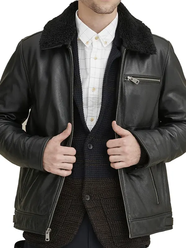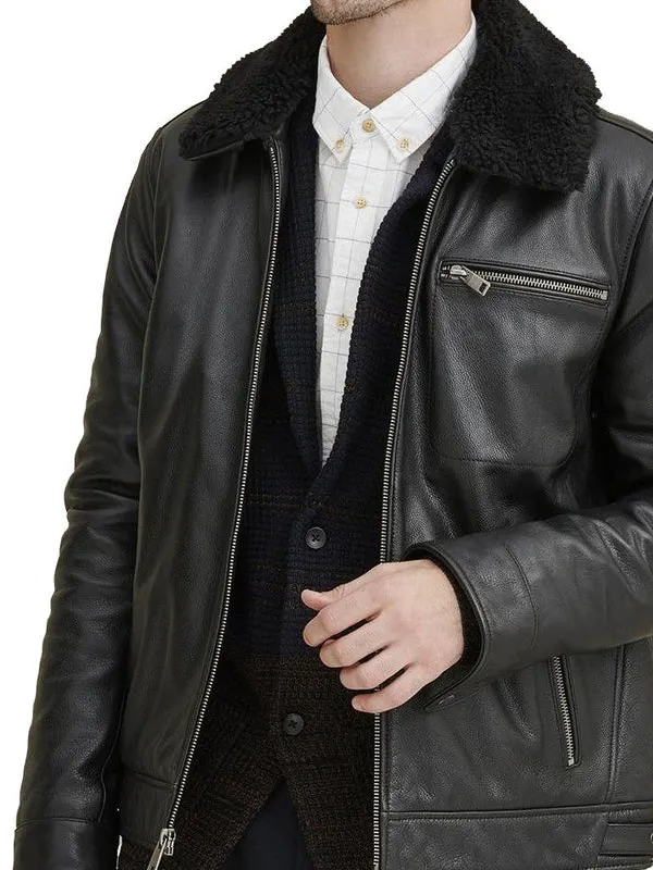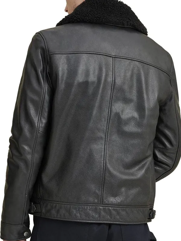 Jules Faux Shearling Collar Black Aviator Leather Jacket