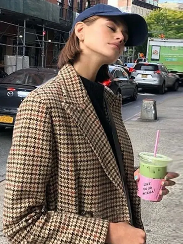 Kaia Gerber Vintage Long Belt Plaid Coat