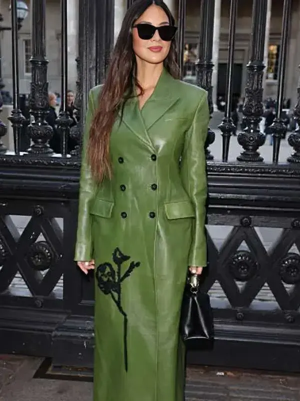 London Fashion Week 2025 Olivia Munn Green Genuine Leather Long Coat
