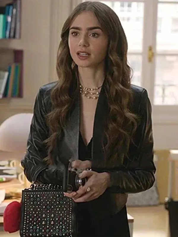 Lily Collins Emily in Paris Black Leather Jacket