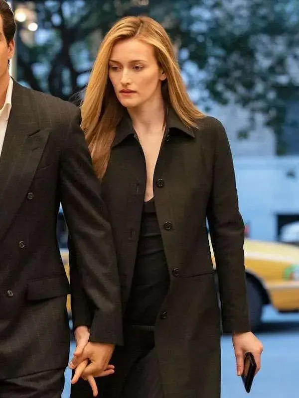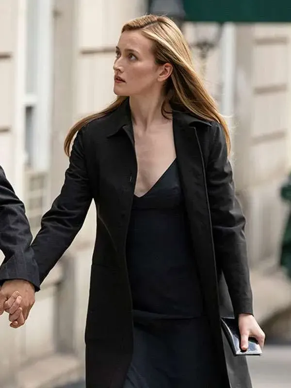 Carolyn Bessette Black Trench Coat from the Love Story series is tailored using cotton fabric with soft viscose lining, full length sleeves, open hem cuffs, shirt style collar, and button closure, featuring two outside pockets and two inside pockets. It is perfect for casual outings, travel wear, and stylish everyday layering.
