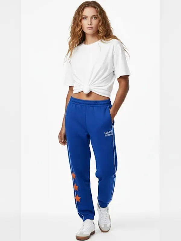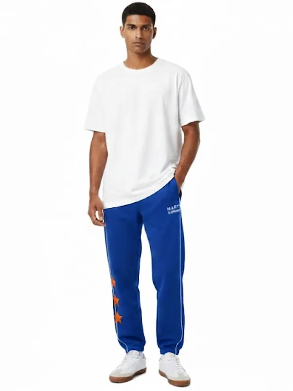 Stand out in these Marty Supreme A24 Blue Athletic Track Trouser. Featuring a vibrant blue hue, these trousers are detailed with elegant white piping and three striking orange stars. The premium fabric and elasticated cuffs provide a superior athletic feel, ensuring you stay comfortable and stylish whether you are at the gym or outdoors.