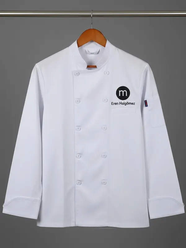 This jacket is worn by contestants on MasterChef Turkey, featuring polyester fabric, viscose lining, a double-breasted front, stand collar, embroidered detailing, and white color with inner pockets. It is perfect for professional chefs, cooking competitions, culinary students, or anyone wanting an authentic, polished kitchen uniform style for modern culinary representation.