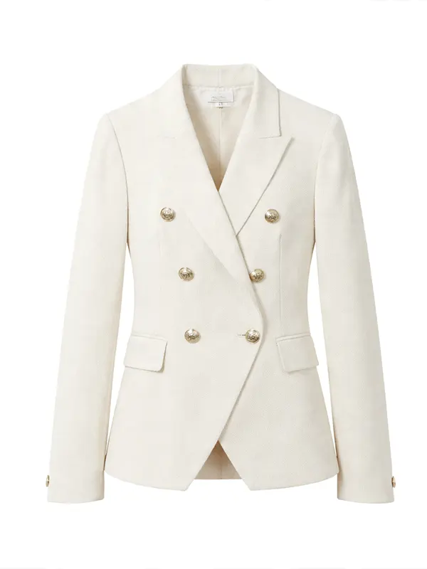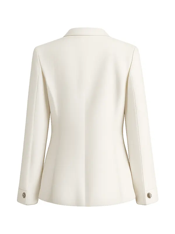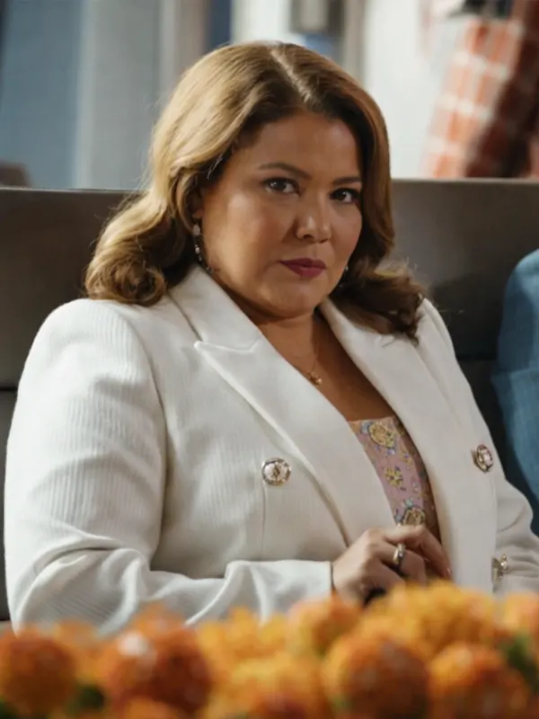 Shine with professional elegance in this exquisite white blazer, inspired by Justina Machado’s character in Matlock Season 2. Tailored from high-quality suiting fabric, it features a chic double-breasted front with striking gold-tone buttons and a sharp peak lapel. This versatile piece effortlessly blends modern style with classic corporate sophistication, making it a must-have for every wardrobe.