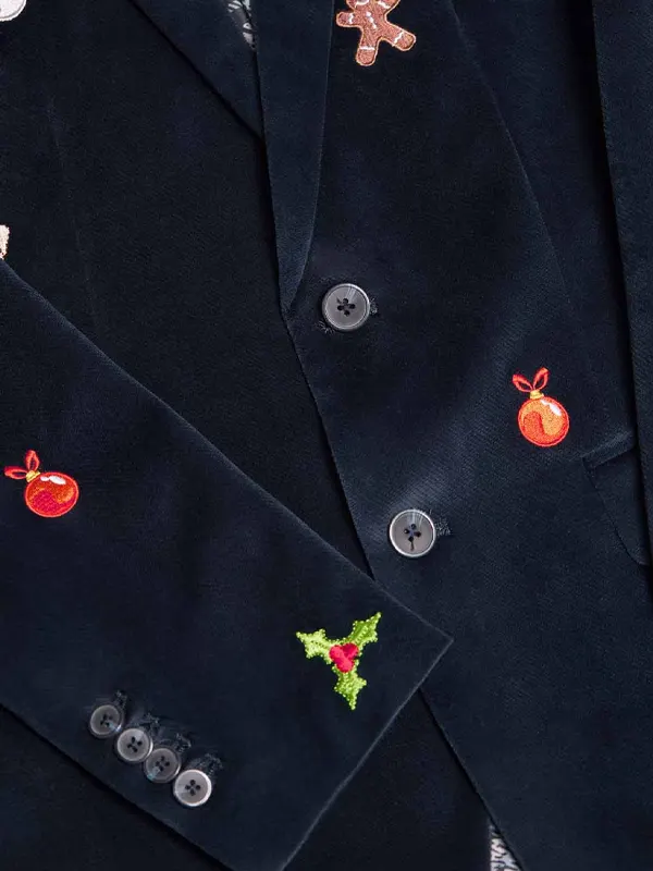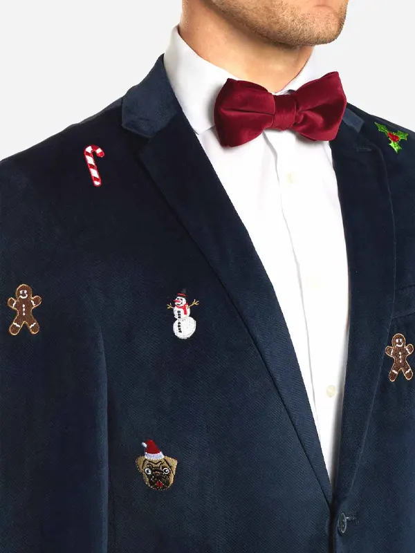 Great blazer for holiday events! Navy color is versatile, fits perfectly, and the festive design is subtle but fun. Very impressed.