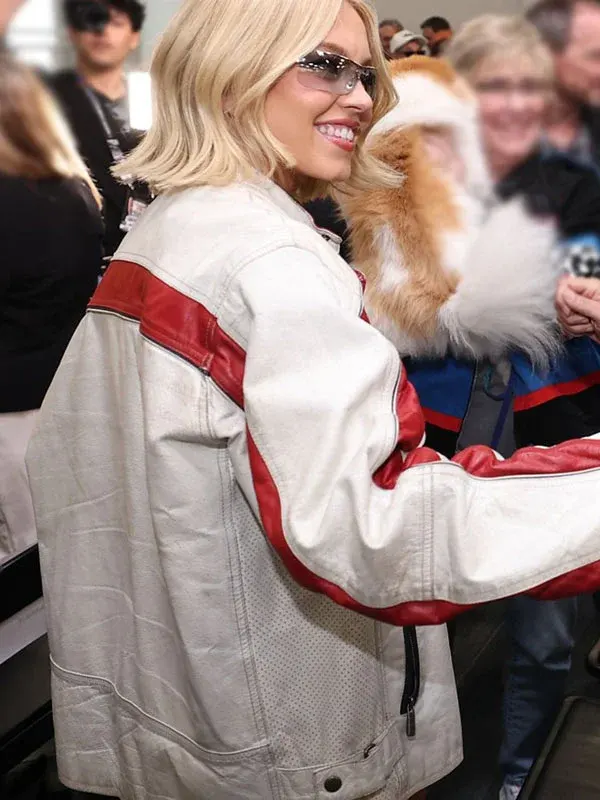 I am a huge fan of NASCAR and Sydney Sweeney. I adore how she is wearing this white leather jacket. After I ordered this jacket online, and purchased it.