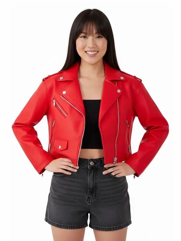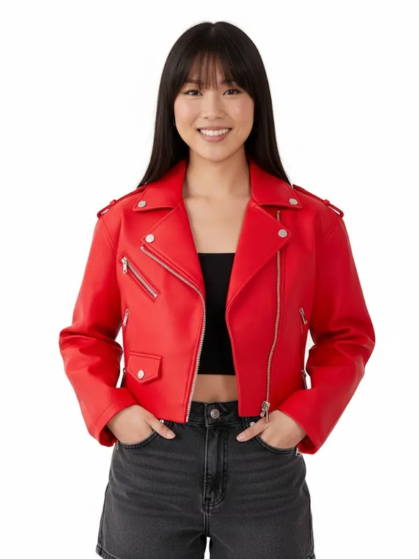 This jacket features vibrant red leather with a trendy cropped biker silhouette, smooth lining, full sleeves, and zip closure for sleek fit. Its bold design adds instant attitude to outfits. It is perfect for parties, night events, streetwear looks, and anyone wanting a modern biker jacket with fashion-forward presence.
