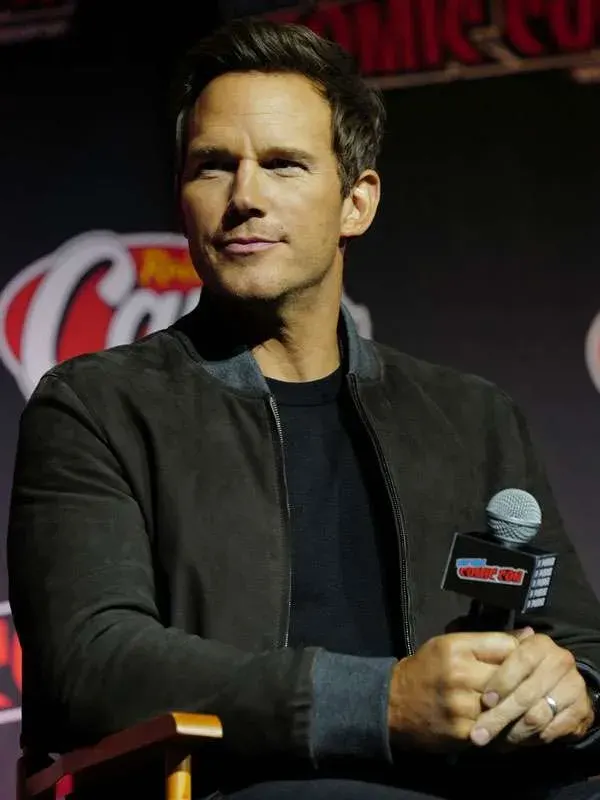 Mercy Movie Premiere New York Comic Con 2025 Chris Pratt Suede Brown Bomber Leather Jacket