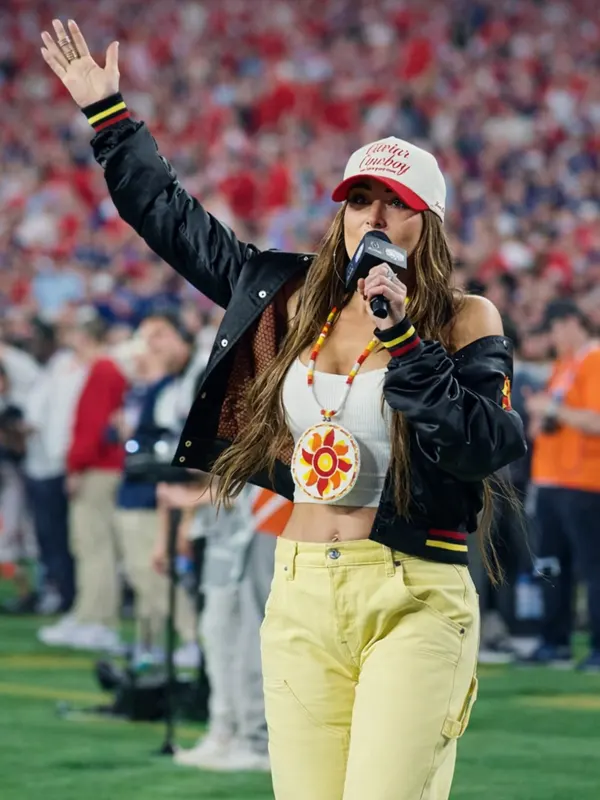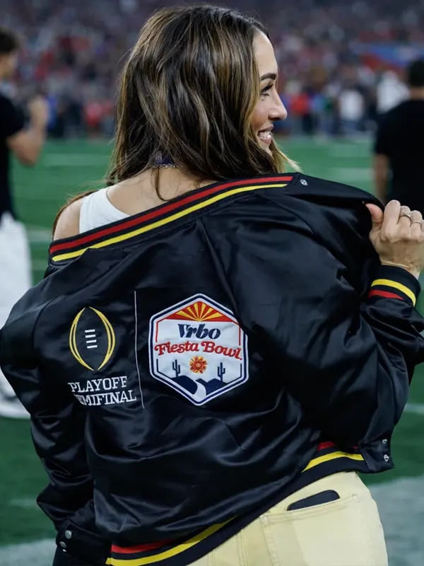 Showcase your athletic spirit with this exclusive black satin bomber jacket, famously worn by Nikki Bella at the Vrbo Fiesta Bowl. It features high-quality satin fabric, a comfortable snap-button closure, and eye-catching multicolored ribbed collars and cuffs. Adorned with official playoff semifinal patches, this lightweight jacket is the perfect blend of sporty style and celebrity-inspired fashion.
