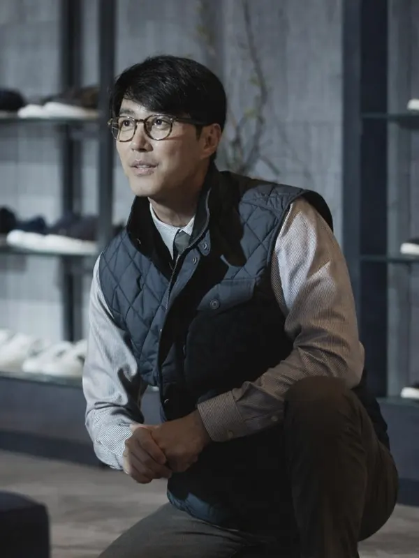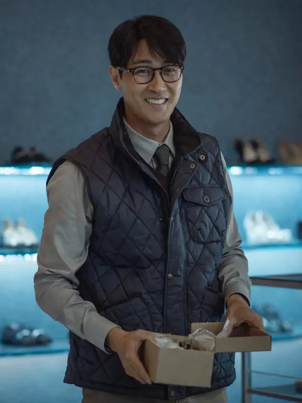 Elevate your layering game with this sophisticated black quilted vest, as seen on Cha Seung-won in No Other Choice. Featuring a classic diamond-quilted pattern and a secure snap-button closure with gold-tone accents, this vest offers a perfect blend of warmth and style. Its lightweight design and functional pockets make it an ideal choice for smart-casual outings.