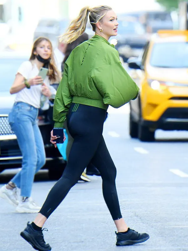 American Model Karlie Kloss NYC Olive Green Cropped Bomber Polyester Jacket
