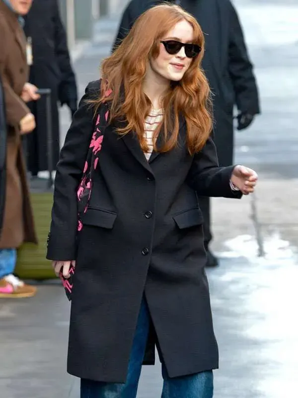 The Sadie Sink Black Wool Coat is made using premium wool fabric with soft viscose lining, full length sleeves, buttoned cuffs, lapel collar, button closure, three outside pockets, and two inside pockets. Ideal for elegant winter wear, casual outings, and stylish everyday looks.