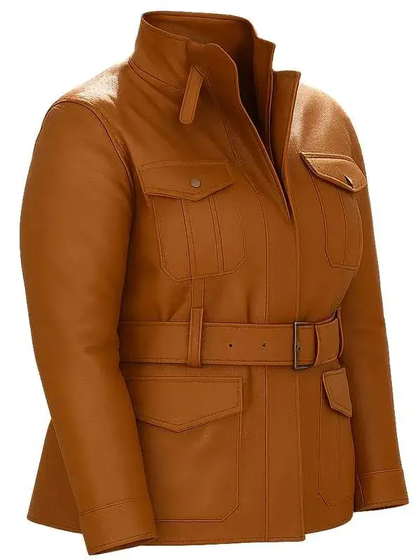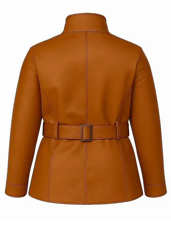 This Emily Trent Brown Jacket from the On Brand with Jimmy Fallon series is crafted using genuine leather with soft viscose lining, full length sleeves, open hem cuffs, stand buckle collar, and belted closure, featuring four outside pockets and one inside pocket. It is perfect for fashion segments, casual outings, and confident modern styling.
