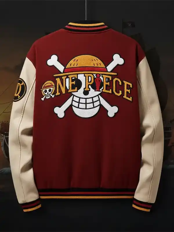 The One Piece Burgundy Varsity Jacket is crafted using wool and leather with soft viscose lining, full length sleeves, ribbed cuffs, and a rib knit collar. It has a button closure, two outside pockets, two inside pockets, and a burgundy and off white color scheme, making it perfect for casual wear.