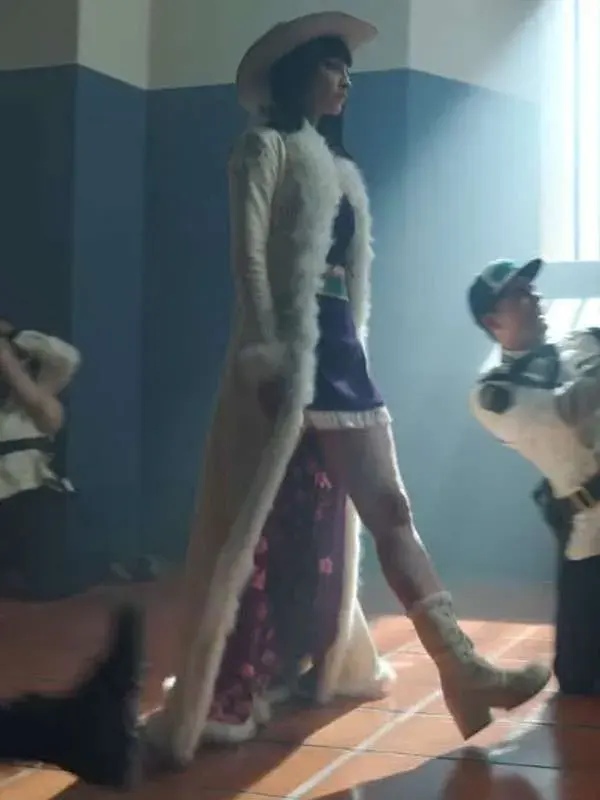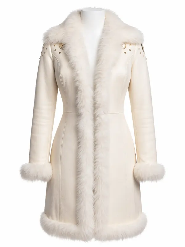 Worn by Lera Abova in the One Piece series, this coat is crafted using genuine leather with soft viscose lining. Featuring full-length sleeves, fur cuffs and collar, open front, two outside pockets, and two inside pockets, its white design makes it perfect for cosplay or stylish casual outings.