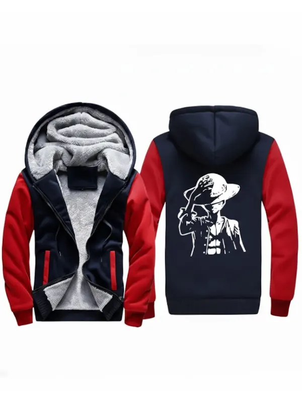 This One Piece Navy Hooded Jacket is crafted using fleece fabric with warm sherpa lining, full length sleeves, ribbed cuffs, a hooded collar with strings, and a smooth zipper closure. It offers two outside pockets and a navy blue and red finish, making it perfect for casual wear and travel.