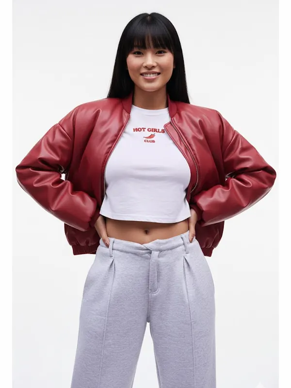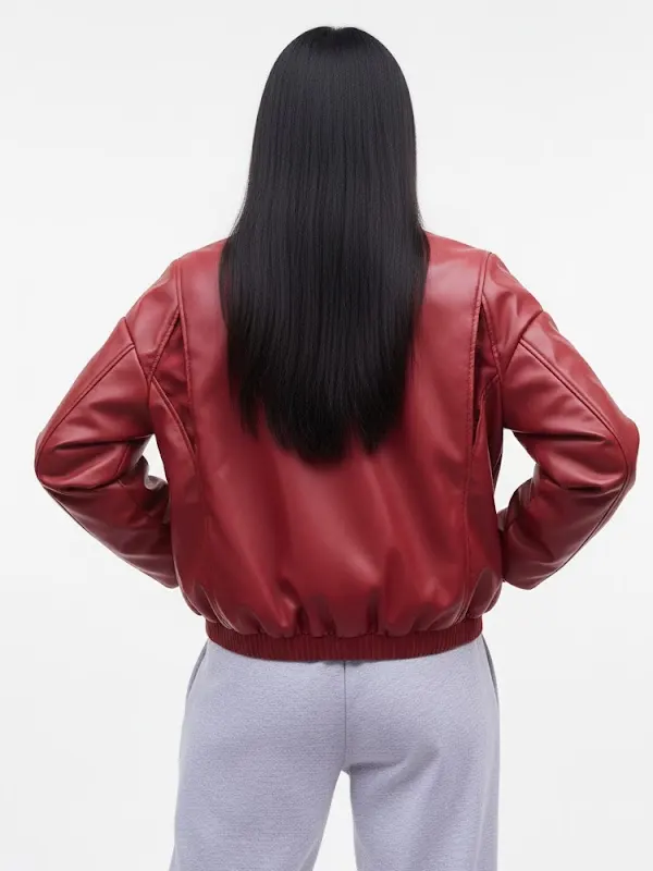 This jacket features cherry red faux leather with oversized bomber styling, soft inner lining, full sleeves, zip closure, and relaxed fit for comfort and flair. It delivers bold color with cozy comfort. It is perfect for streetwear street style, casual days out, travel outfits, or anyone wanting fashion with a confident twist.