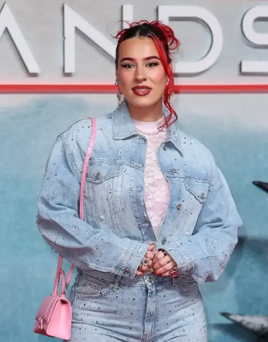 Movie Predator Badlands UK Premiere Megan Bolton 2025 Blue Denim Cropped Jacket