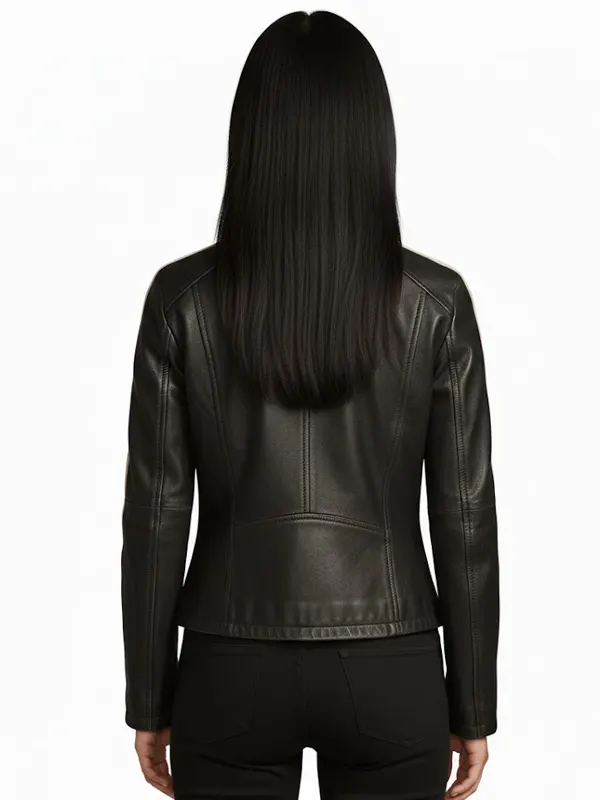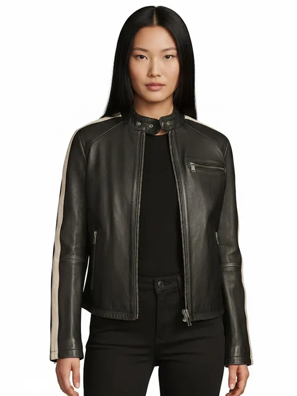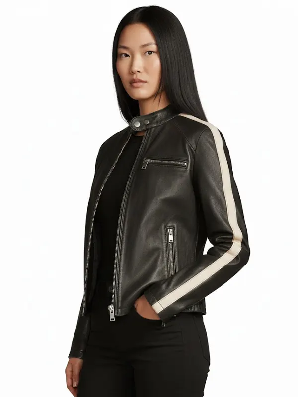 This jacket features black leather with white racing stripes, smooth inner lining, full sleeves, and a cafe racer silhouette that adds a sporty attitude. Its bold contrast delivers standout appeal. It is perfect for streetwear looks, casual rides, night outings, or anyone wanting a dynamic leather jacket with racing-inspired energy.