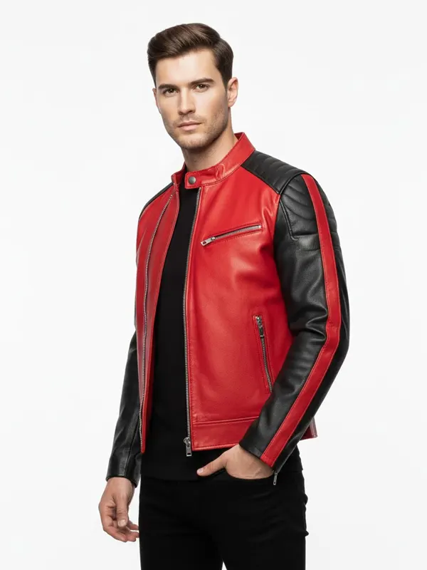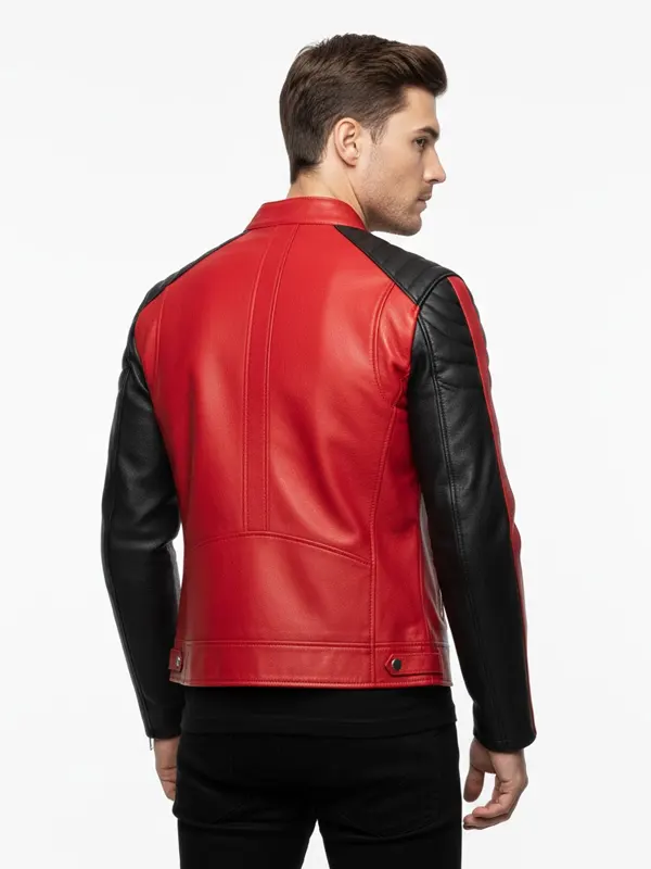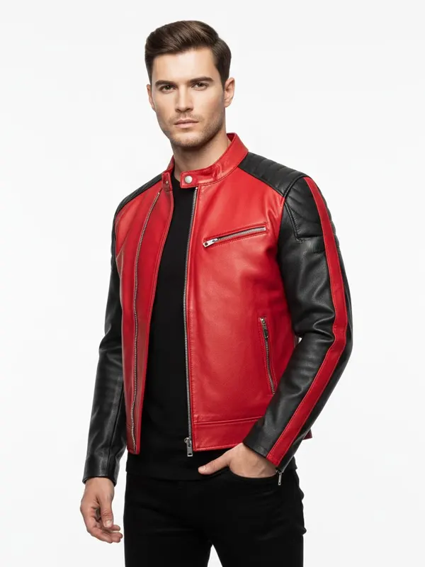 This jacket delivers a classic cafe-racer vibe with red and black leather, full sleeves, fitted silhouette, and a smooth inner lining. Its contrasting color scheme and clean design make it versatile yet bold. Perfect for bike rides, urban streetwear, casual hangouts, or anyone wanting a leather jacket that balances style and attitude.