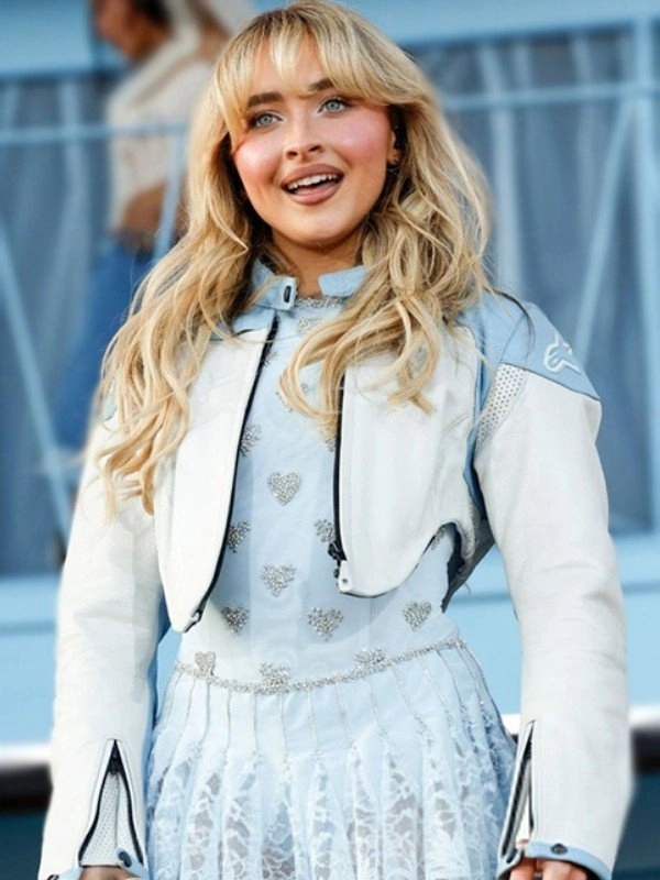 Music Festival Coachella 2024 Sabrina Carpenter Cropped Blue and White Leather Jacket