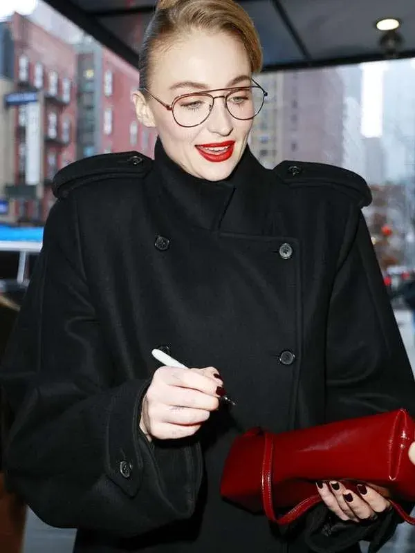 Sophie Turner Oversized Black Coat is built using soft wool fabric with viscose lining, full length sleeves, belted cuffs, stand up collar, button closure, two outside pockets, and two inside pockets. Perfect for winter layering, casual streetwear, and stylish cozy appearances.