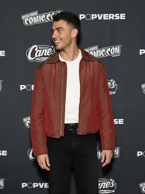 George Hawkins Red Jacket from the Star Trek Starfleet Academy comic con event is crafted using polyester fabric with soft viscose lining, full length sleeves, open hem cuffs, shirt style collar, and zipper closure, featuring two outside pockets and two inside pockets. It is perfect for casual wear, sci fi inspired looks, and everyday futuristic fashion.